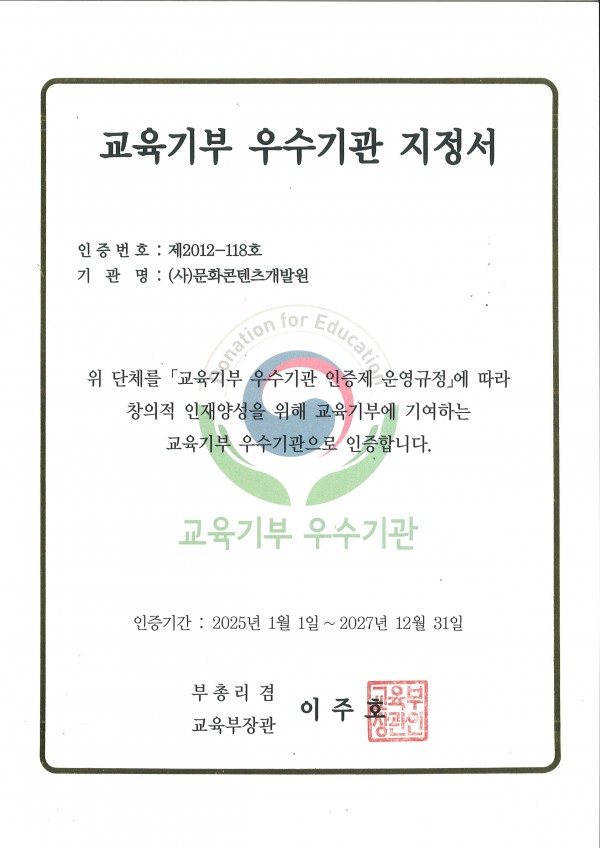 교육부 교육기부우수기관 인증서