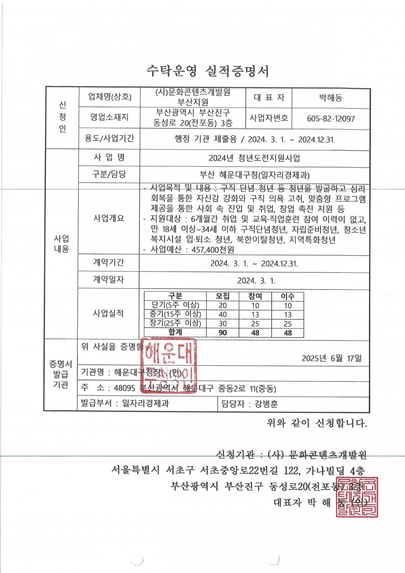 고용노동부*해운대구(이하 “해운대구”라 한다) 와 (사)문화콘텐츠개발원(이하“운영기관”이라 한다) 은 2024년 청년도전지원사업(이하 “청년도전 지원사업”이라한다)을 운영함에 있어 시행에 관하여 다음과 같이 협약을 체결한다.