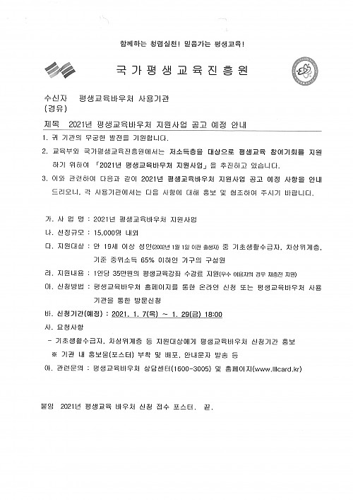 [국가시험&교육센터] 2021 원하는 강좌를 자유롭게 평생교육바우처 수강생 모집