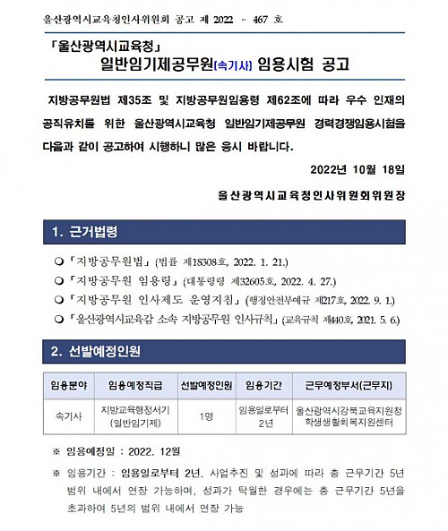 [뉴스/취업정보] 울산광역시교육청 일반임기제공무원(속기사) 임용시험 공고