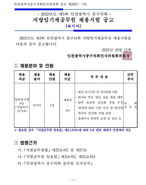 [뉴스/취업정보] 인천광역시 중구의회 지방임기제공무원 채용시험 공고