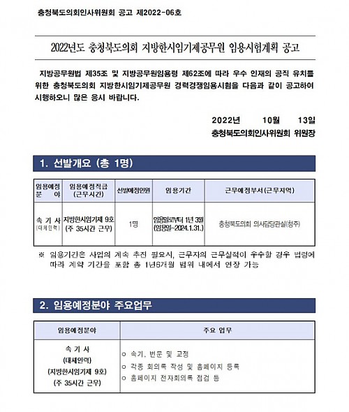 [뉴스/취업정보]2022년도 충청북도의회 지방한시임기제공무원 임용시험계획 공고