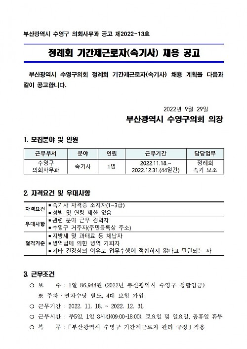 [뉴스/취업정보]수영구의회 정례회 기간제근로자(속기사) 채용 공고