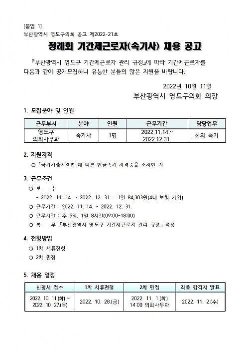 [뉴스/취업정보] 영도구의회 정례회 기간제근로자(속기사) 채용공고
