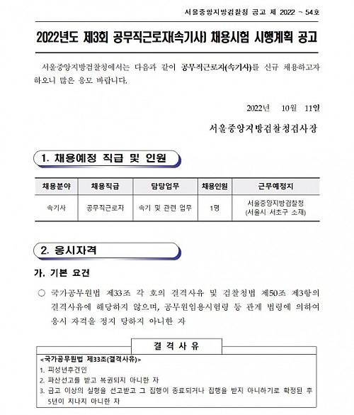 [뉴스/취업정보] 서울중앙지방검찰청 2022년도 제3회 공무직근로자(속기사) 채용 공고