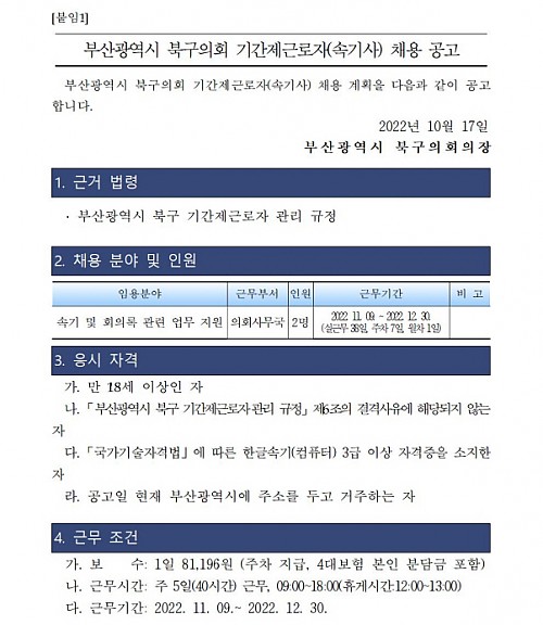 [뉴스/취업정보]부산광역시 북구의회 기간제근로자(속기사) 채용 공고