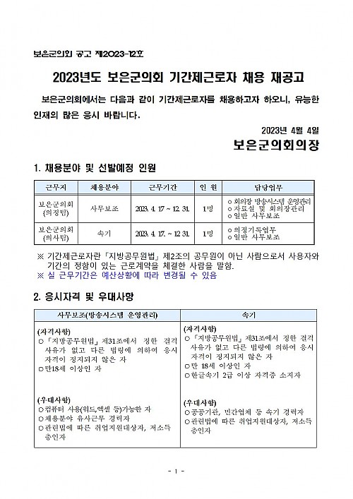 [취업정보]기업명 - 보은군의회기업형태 - 공공기관채용공고 마감일 - 2023년 04월 10일채용인원 - 2명