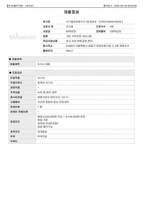 [취업정보]기업명 - 속기법인혜정속기기업형태 - 중소기업채용인원 - 1명