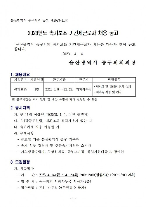 [뉴스/취업정보] 울산광역시 중구의회 속기사 채용공고 (~4/18)
