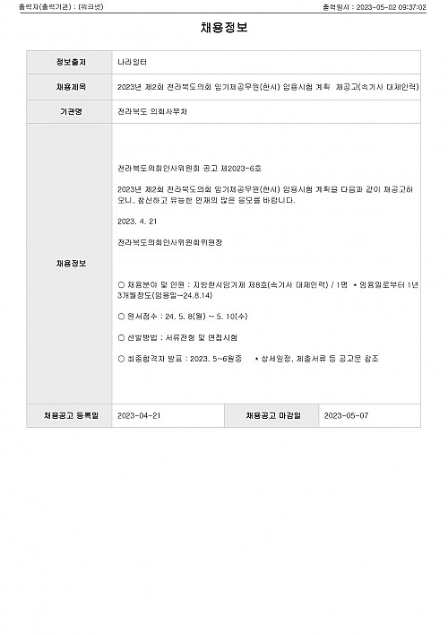 [취업정보]기업명 - 전라북도 의회사무처기업형태 - 공공기관채용공고 마감일 - 2023년 05월 10일채용인원 - 1명
