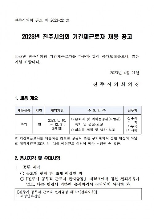 [취업정보]기업명 - 진주시의회기업형태 - 공공기관채용공고 마감일 - 2023년 04월 28일채용인원 - 1명