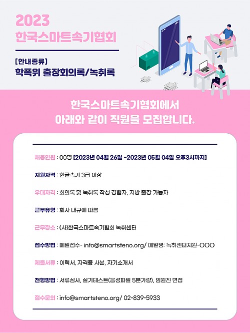 [취업정보]기업명 - 한국스마트속기협회기업형태 - 기타 협회 및 단체채용공고 마감일 - 2023년 05월 04일