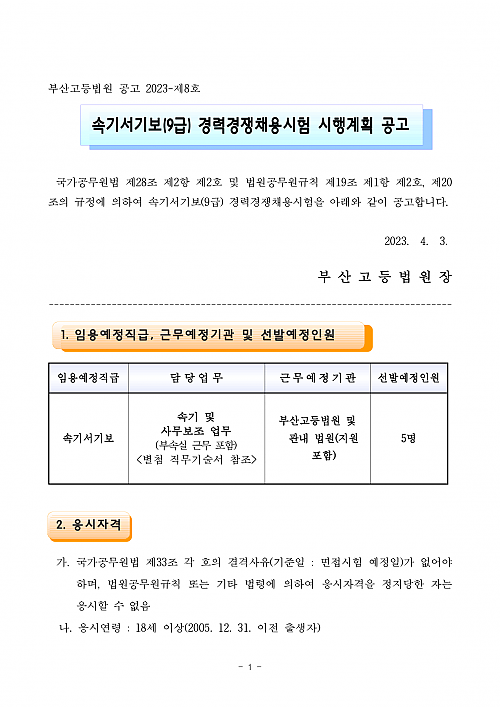 [뉴스/취업정보] 부산고등법원 속기서기보 채용 공고