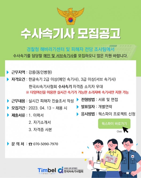 [뉴스/취업정보] 경찰청 해바라기센터 메인, 서브 수사속기사 모집(강릉) 채용공고