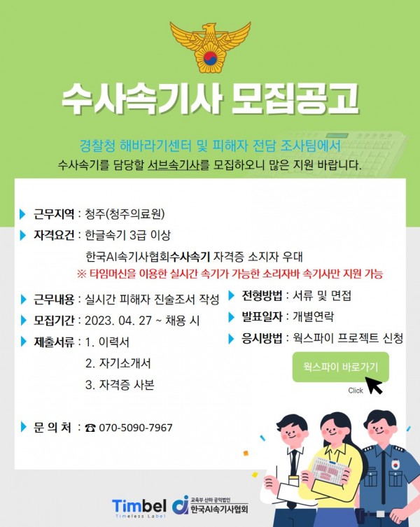 [뉴스/취업정보] 경찰청 해바라기센터 수사속기사 모집(청주) 채용공고