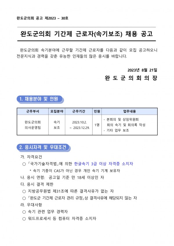 [뉴스/취업정보] 완도군의회 속기사 채용공고 (~8/31)