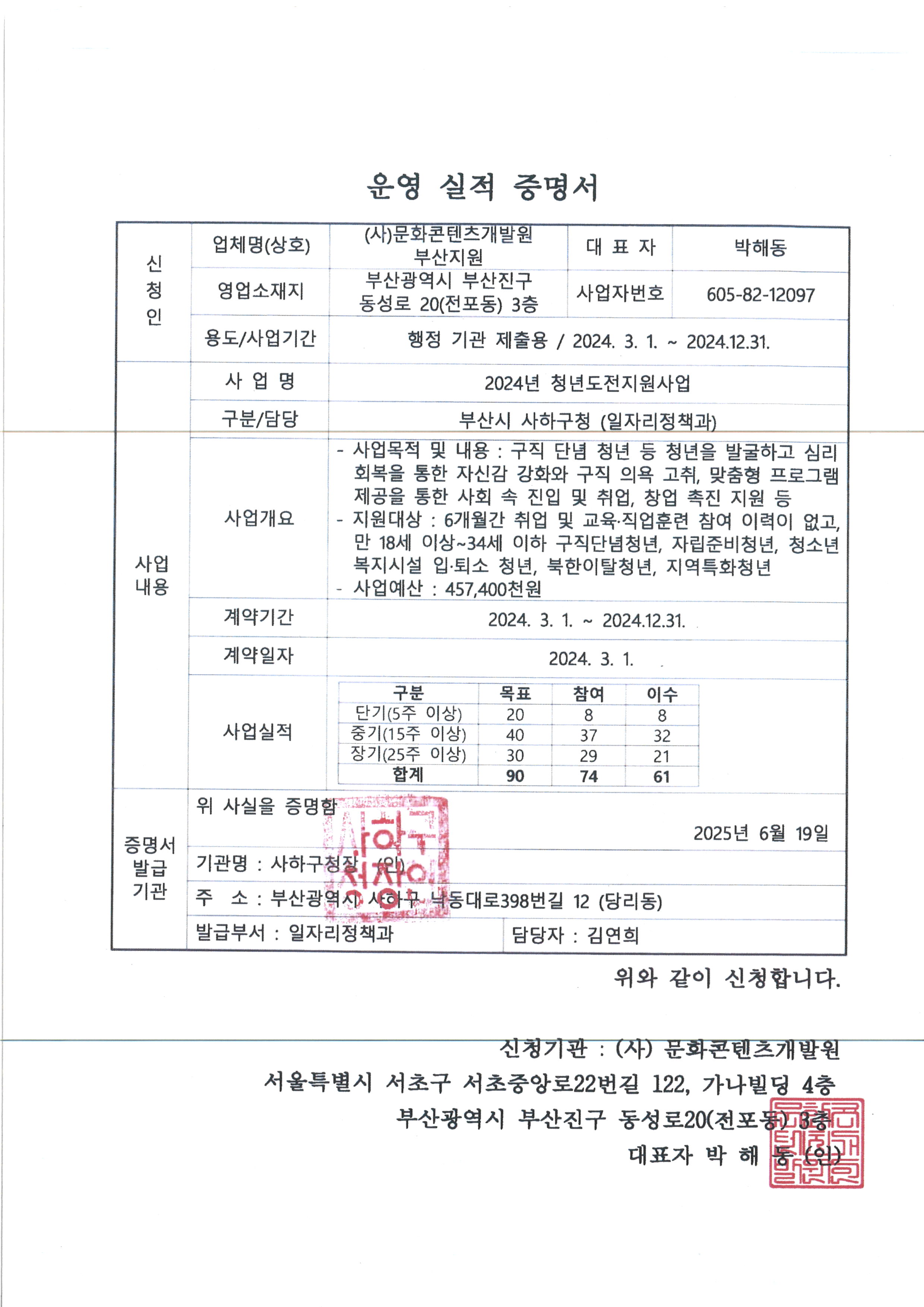 2024년 부산광역시 사하구청 청년도전 지원사업에 관한 협약서