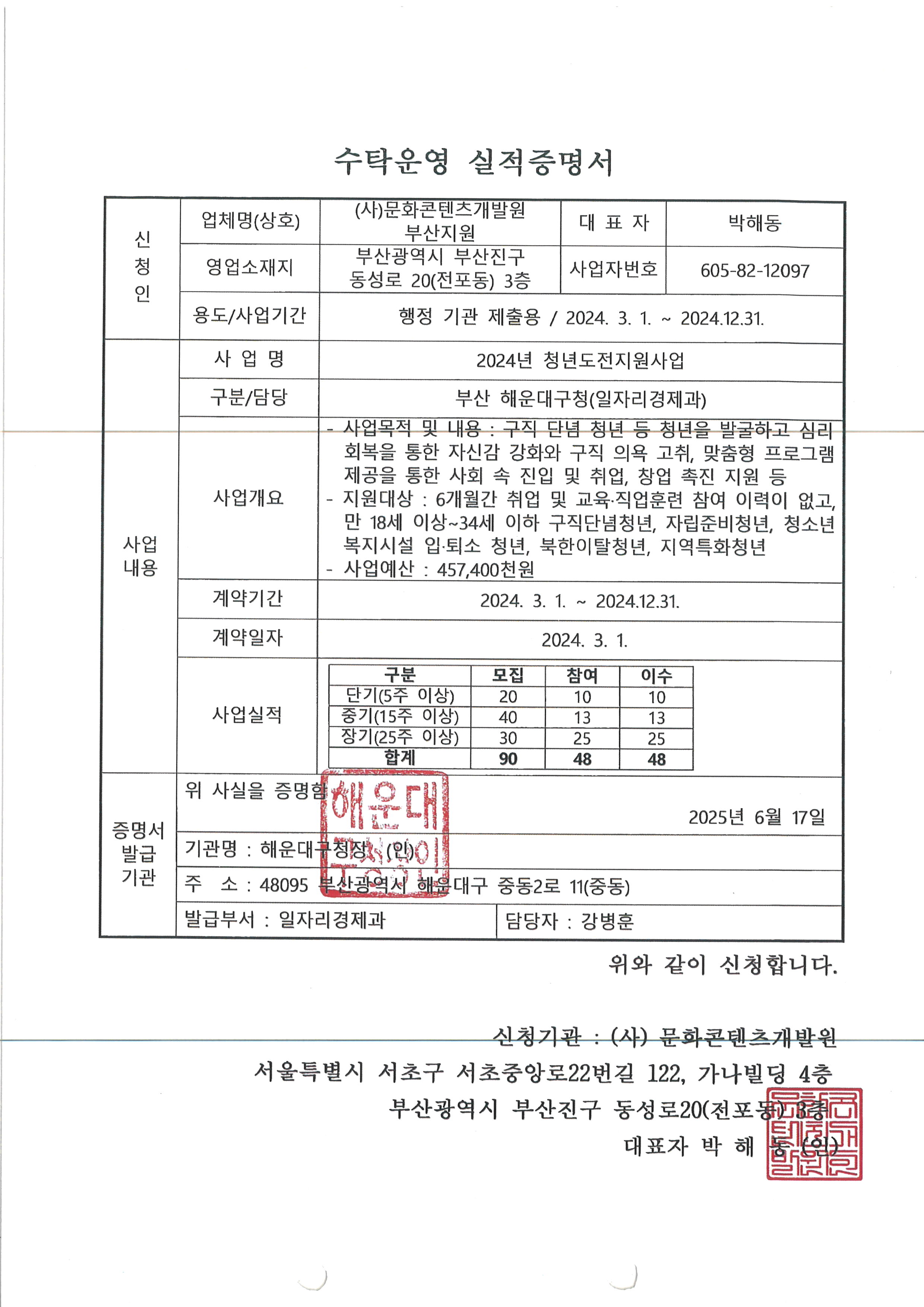 2024년 부산광역시 해운대구 청년도전 지원사업에 관한 협약서