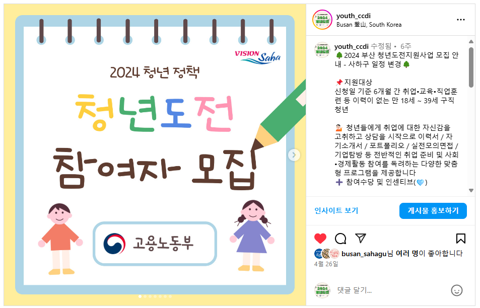 [24-04-26] [인스타그램_홍보] 2024 부산 청년도전지원사업 모집 안내 - 사하구 일정 변경