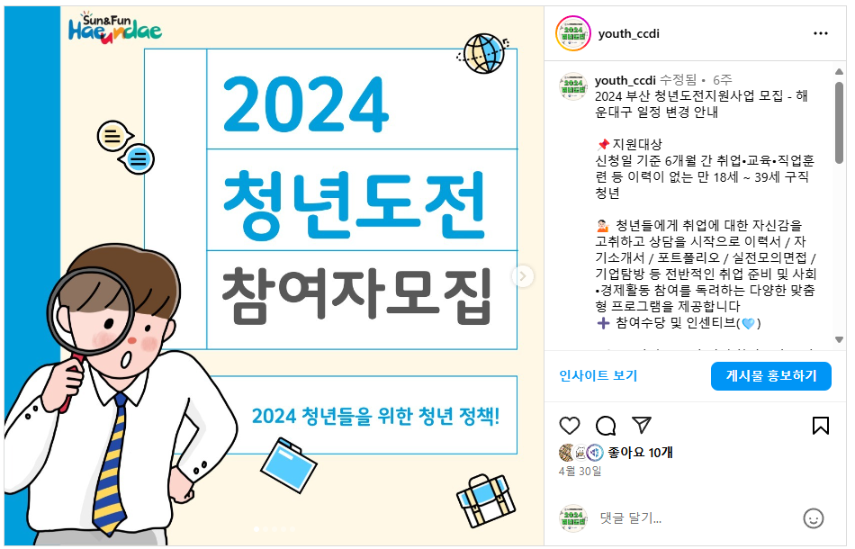 [24-04-30] [인스타그램_홍보] 2024 부산 청년도전지원사업 모집 - 해운대구 일정 변경 안내