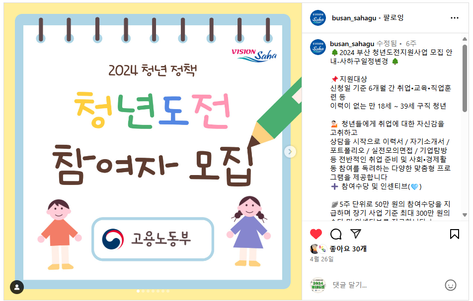 [24-04-30] [인스타그램_홍보] (사하구) 2024 부산 청년도전지원사업 모집 안내-사하구일정변경