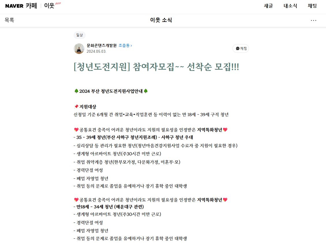 [24-05-03] [네이버우리동네 소식_홍보] [청년도전지원] 참여자모집~~ 선착순 모집!!!