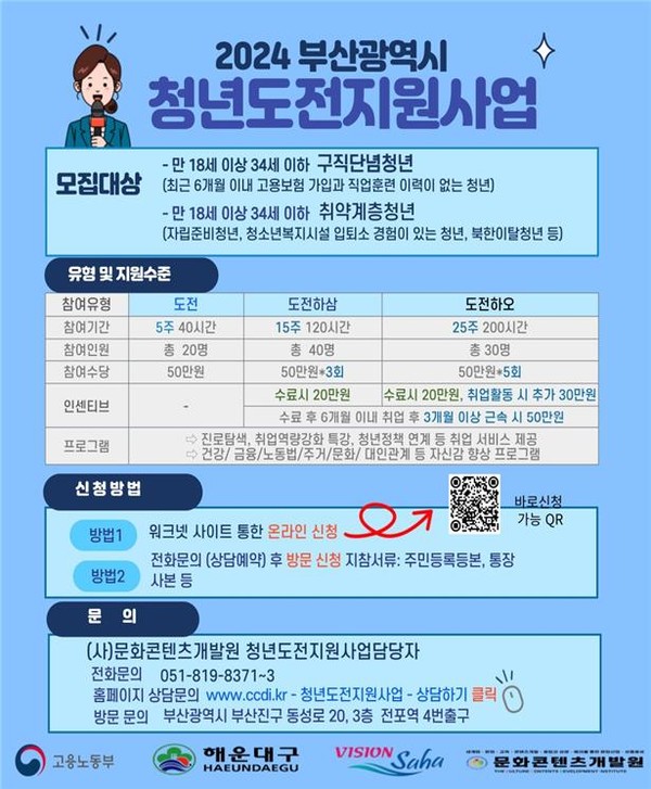 참여자 신청방법은 워크넷 사이트를 통한 온라인으로 신청하거나, (사)문화콘텐츠개발원 청년도전지원사업 담당자(전화 051-819-8371-3), 홈페이지 www.ccdi.kr-청년도전지원사업-상담하기를 클릭하면 된다. 방문문의는 부산광역시 부산진구 동성로 20, 3층 전포역 4번 출구로 나가면 된다.