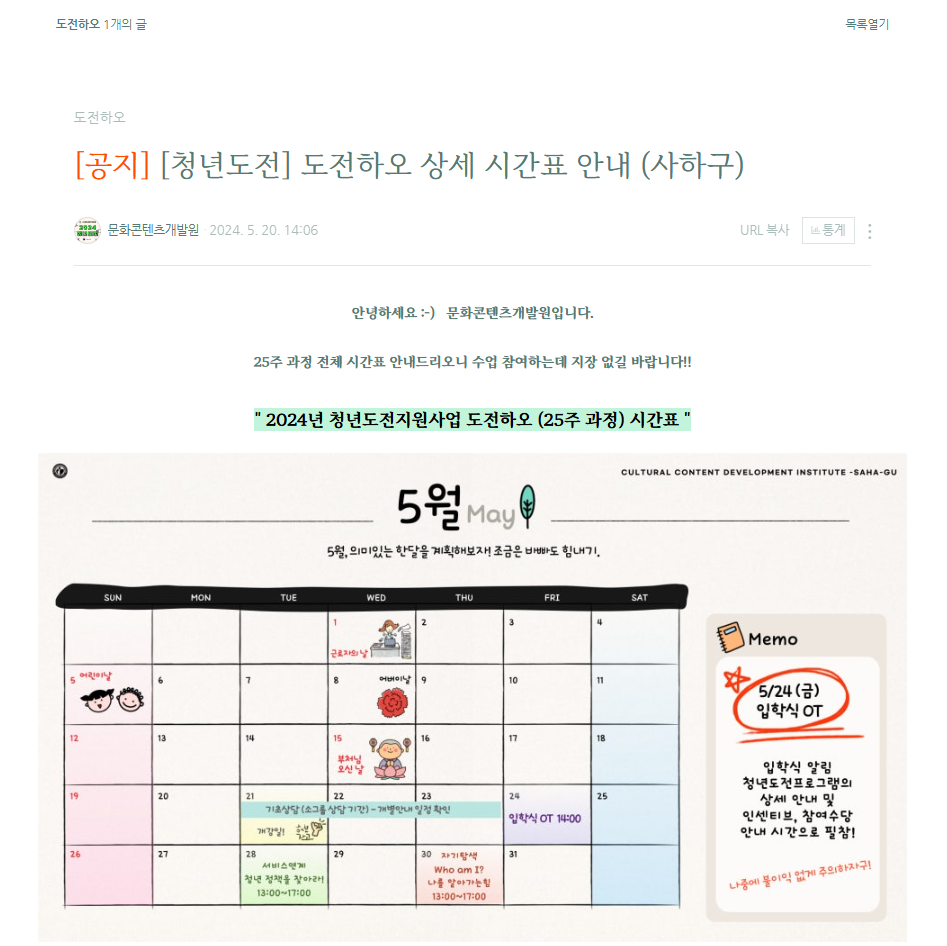 [24-05-20] [블로그_홍보] [공지] [청년도전] 도전하오 상세 시간표 안내 (사하구)