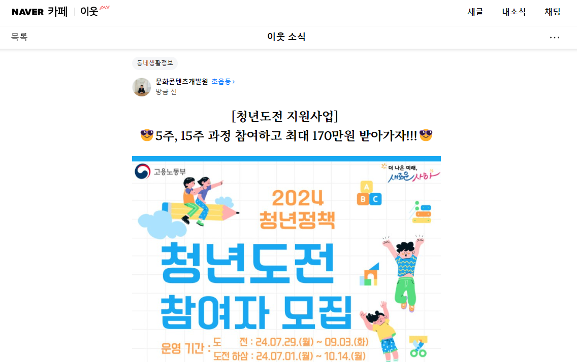 [24-06-17] [네이버 우리동네 이웃 소식_홍보] [청년도전 지원사업] 5주, 15주 과정 참여하고 최대 170만원 받아…