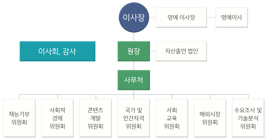 | 명칭 | 연락처 | 소관 | 소재지 및 비영리법인 설립, 원장 | 홈페이지 |