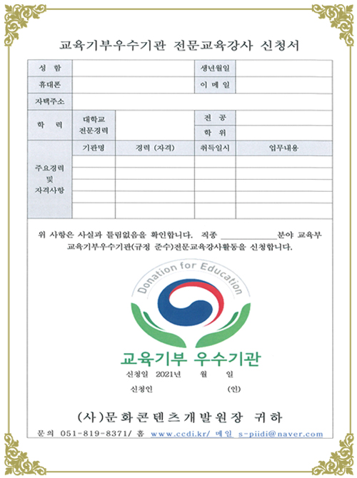 - 인적자원 기부(개인)- 문·예·체 교육 진로 멘토링, 강연, 전문분야의 재능 기부, 자원봉사 등